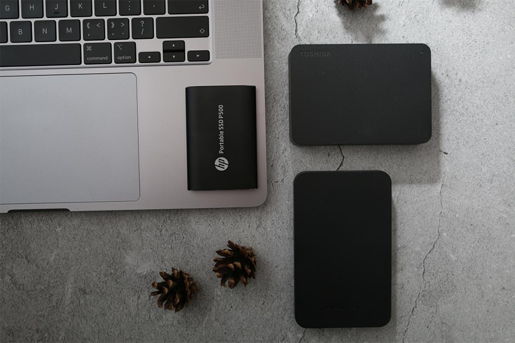 從上到下看,惠普P500兩邊做了圓潤(rùn)的處理,握在手里也很小,有點(diǎn)像一塊“肥皂”。下面是我在用的三個(gè)移動(dòng)硬盤對(duì)比圖,右側(cè)的是4TB的東芝機(jī)械硬盤,左面的是撿垃圾的256GB移動(dòng)硬盤放到硬盤盒里,中間自然是惠普P500了。