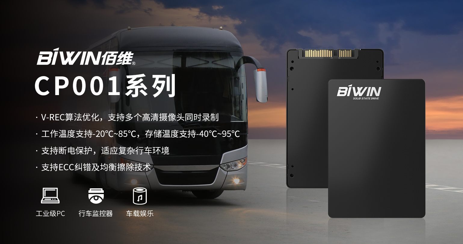 行車監(jiān)控器、車載娛樂等車載應用已經(jīng)十分普遍,針對此類大量數(shù)據(jù)、長時間的讀寫需求,佰維CP001系列SSD通過V-REC算法優(yōu)化進行專項的固件調校,可保持車載SSD持續(xù)不間斷地寫入數(shù)據(jù),從而支持多個高清攝像頭同時錄制。支持-20℃~+85℃寬溫工作,無懼極端溫度挑戰(zhàn),廣泛應用于大巴車、觀光車及危險品運輸車等汽車車載應用中。