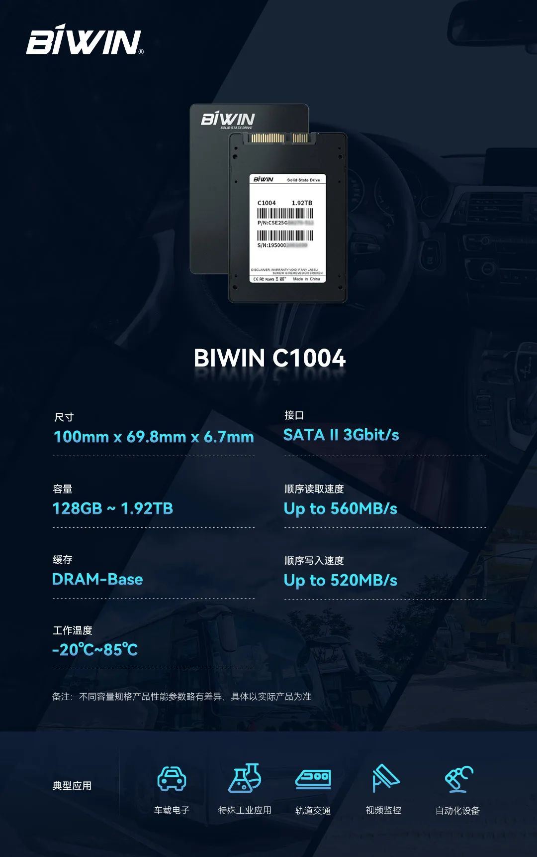 專為車載NVR/DVR監(jiān)控系統(tǒng)打造,佰維C1004系列SSD最大容量1.92TB,外置SATA接口,采用 V-REC算法使高密度數(shù)據(jù)讀寫不掉速,另支持寬電壓、溫度感應(yīng)、耐高低溫、固件備份、SMART監(jiān)控、掉電保護等功能,多項加固設(shè)計輕松應(yīng)對顛簸、震動環(huán)境下數(shù)據(jù)存儲的挑戰(zhàn),實現(xiàn)車載監(jiān)控數(shù)據(jù)全天候、持續(xù)、穩(wěn)定、安全地記錄與保存,具備高品質(zhì)、高性能、高耐用性等優(yōu)異特性。