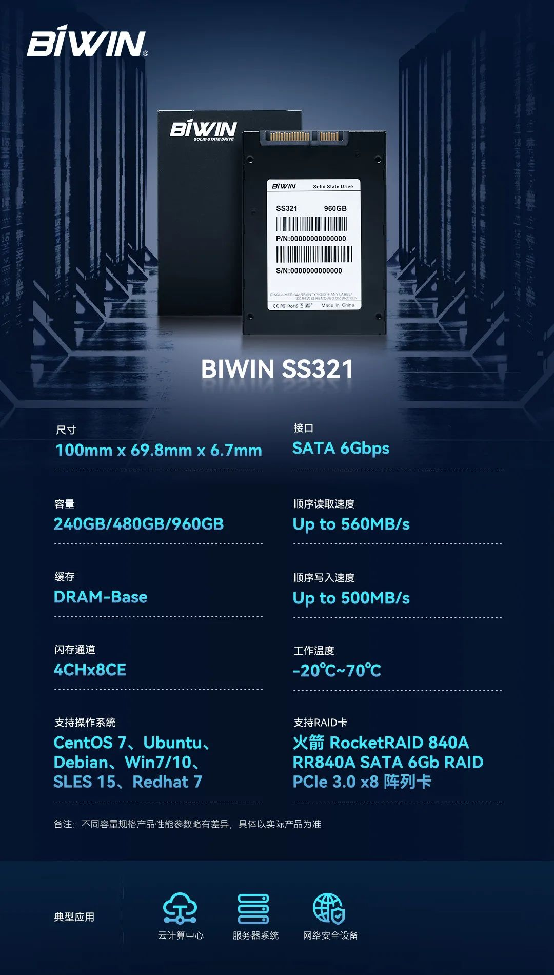 該產(chǎn)品核心元器件采用國產(chǎn)品牌產(chǎn)品,搭配自研固件算法,使用SATA 6Gbps接口規(guī)范,搭載DDR4外置緩存,最大順序讀寫速度分別達(dá)到560MB/s、500MB/s,可覆蓋240GB-960GB入門級服務(wù)器容量需求,性能良好的同時功耗更低、能效比更高。SS321系列 SATA 2.5" SSD,為企業(yè)級客戶構(gòu)建強大的云計算中心、服務(wù)器系統(tǒng)、網(wǎng)絡(luò)安全設(shè)備等多維業(yè)務(wù)體系提供了安全可靠的存儲解決方案。