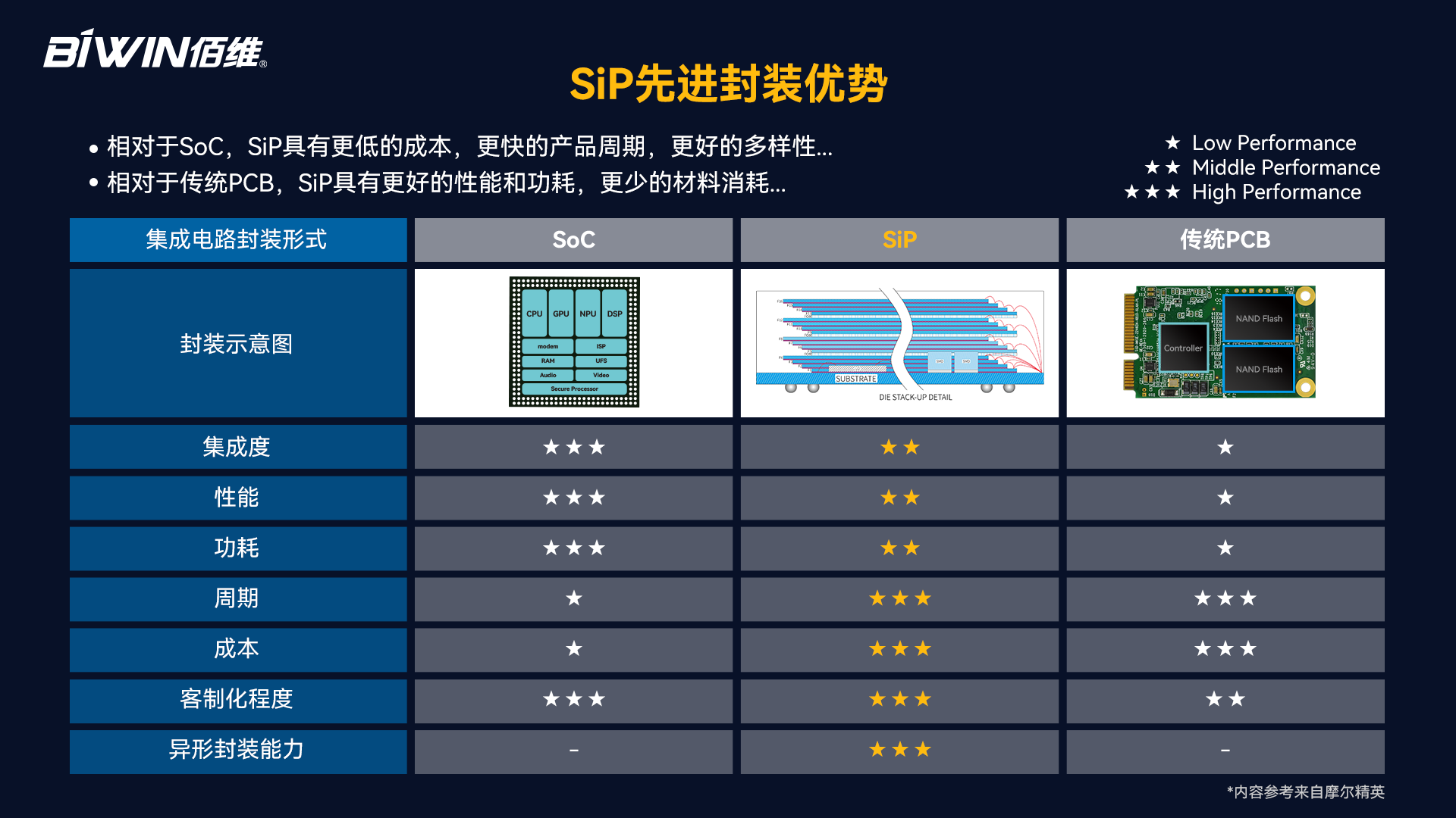 以佰維BGA SSD EP400(PCIe Gen4.0x2)為例,該產(chǎn)品在11.5*13mm空間內(nèi)集成了NAND、控制器和DRAM等組件,構(gòu)成了完整的存儲器系統(tǒng),是典型的SiP封裝工藝,與SoC和傳統(tǒng)PCB工藝相比,SiP封裝工藝可以使BGA SSD同時兼具高集成度、高性能、小尺寸、大容量、低成本等優(yōu)勢,在客戶端實現(xiàn)了綜合性價比最高。