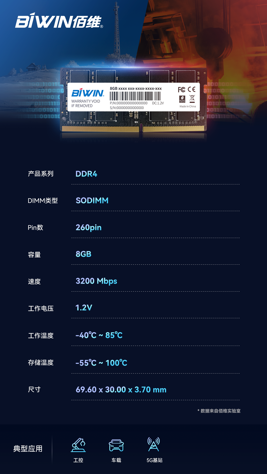 聚焦5G基站、邊緣計(jì)算、AI設(shè)備、車載應(yīng)用、工控安防等領(lǐng)域,越來越多的工業(yè)類應(yīng)用及設(shè)備對(duì)存儲(chǔ)解決方案提出了更高要求:長時(shí)間持續(xù)高速運(yùn)算及嚴(yán)苛的運(yùn)作環(huán)境下,存儲(chǔ)產(chǎn)品必須擁有高穩(wěn)定性、高可靠性,也必須經(jīng)過適應(yīng)極端溫度變化、防塵、抗震動(dòng)、抗沖擊、抗硫化等種種考驗(yàn),從而保持高耐久度和長使用壽命。近期,佰維推出工業(yè)級(jí)寬溫SODIMM內(nèi)存條,賦能嚴(yán)苛環(huán)境挑戰(zhàn)下的各種工業(yè)應(yīng)用。