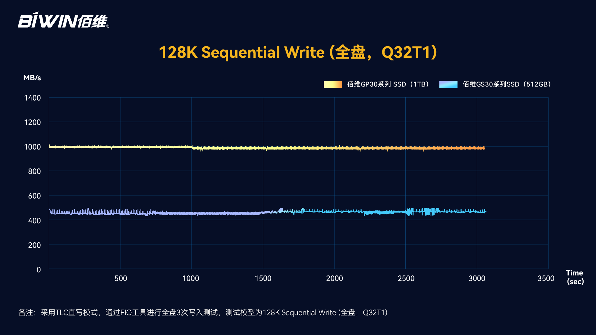 通過(guò)搭配全自研固件,系列產(chǎn)品具備優(yōu)異的性能,其中GP30系列SSD采用PCIe Gen3.0x4接口、NVMe1.4協(xié)議,最高順序讀寫(xiě)速度分別達(dá)到3400MB/s、2700MB/s,容量最高可達(dá)2TB。此外,基于固件的多重優(yōu)化,GP30/GS30系列SSD的數(shù)據(jù)持續(xù)讀取、寫(xiě)入性能穩(wěn)定,在FIO測(cè)試中,GP30系列SSD全盤(pán)寫(xiě)入速度約保持在1000MB/s,GS30系列SSD全盤(pán)寫(xiě)入速度約保持在450MB/s。
