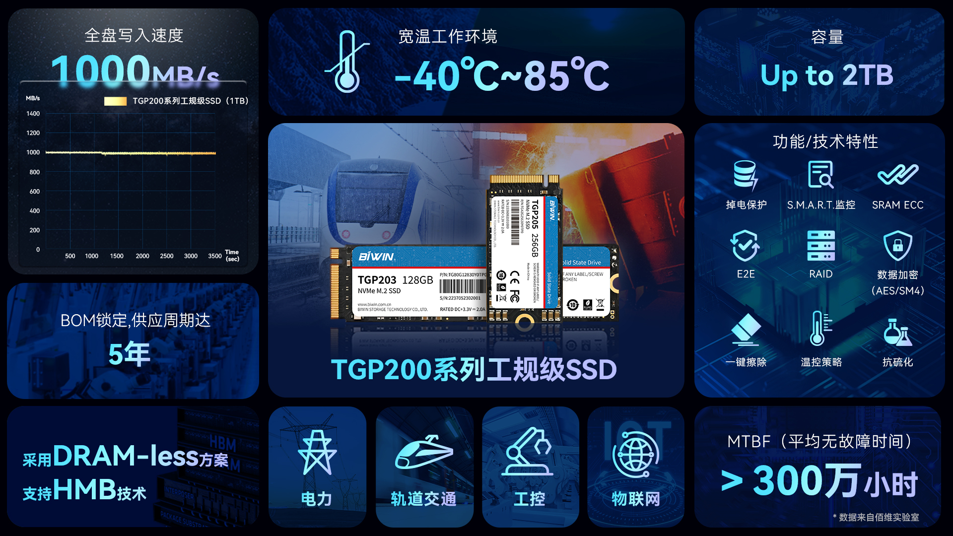在可靠性方面,TGP200系列產(chǎn)品均采用了符合寬溫標(biāo)準(zhǔn)的閃存顆粒、元器件,并經(jīng)過高低溫測試、功能測試、硬件測試、性能測試、可靠性測試、兼容性測試等多重嚴(yán)苛測試驗(yàn)證,支持-40℃~85℃寬溫工作、-55℃~95℃寬溫存儲、掉電保護(hù)(PLP)、S.M.A.R.T.監(jiān)控、RAID、ECC、E2E、溫控策略等特性,MTBF高達(dá)300萬小時,可從容應(yīng)對極端溫度、異常斷電等嚴(yán)苛環(huán)境,有效保證數(shù)據(jù)的可靠性與完整性。同時,公司可提供抗硫化、三防涂層、一鍵擦除、數(shù)據(jù)加密等客制化服務(wù),進(jìn)一步保護(hù)產(chǎn)品,延長產(chǎn)品壽命。
