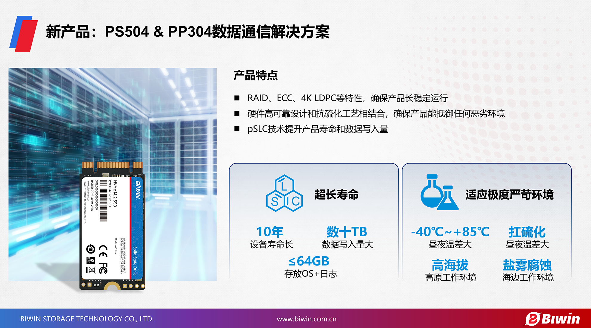 深圳佰維存儲工車規(guī)事業(yè)部總經(jīng)理彭鵬著重介紹了主打數(shù)據(jù)通信應用的SSD PS504、PP304與主打視頻監(jiān)控應用的存儲卡TGC207、TGC209。主打數(shù)據(jù)通信應用的SSD PS504、PP304在RAID、ECC、4K LDPC等特性加持下能保障長期穩(wěn)定運行,硬件高可靠設計和抗硫化工藝相結合確保產(chǎn)品能抵御任何惡劣環(huán)境,pSLC技術的應用進一步提升了產(chǎn)品壽命和數(shù)據(jù)寫入量。