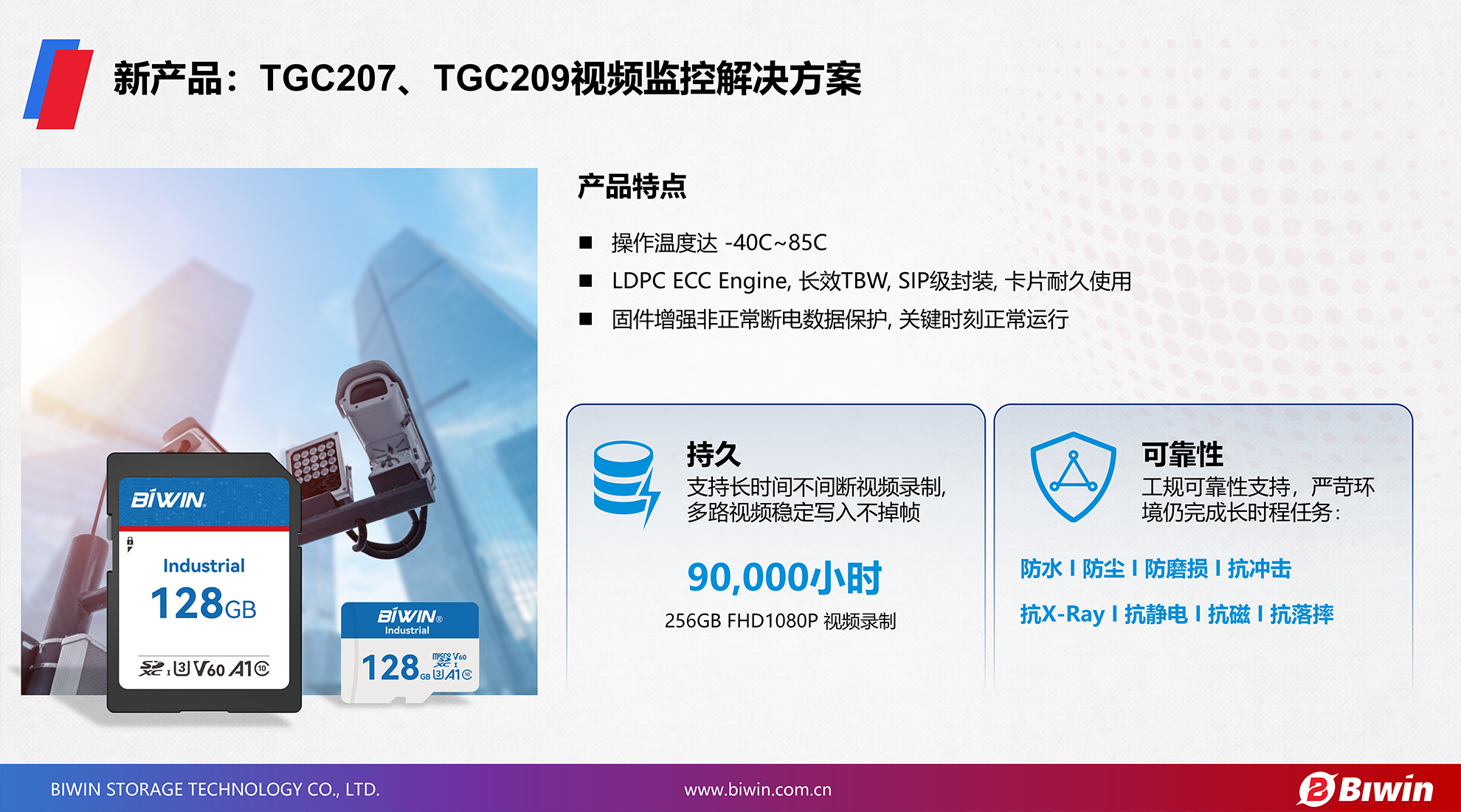 主打視頻監(jiān)控應用的存儲卡TGC207、TGC209采用SIP級封裝,操作溫度覆蓋-40℃~85℃, 內置LDPC ECC Engine,擁有長效TBW特性,能在嚴苛環(huán)境下不間斷視頻錄制完成長時程任務, 多路視頻穩(wěn)定寫入不掉幀,并采用固件增強非正常斷電數(shù)據(jù)保護,保障關鍵時刻的正常運行。